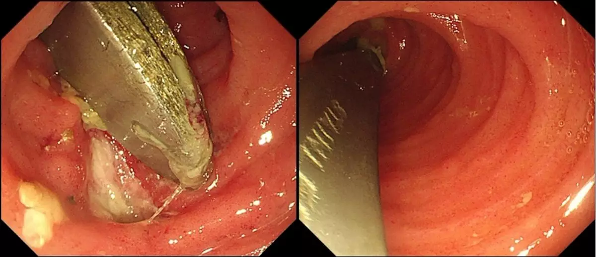 入院後,醫生為張先生再次安排CT及腸鏡檢查,確認兩把匙羹卡在回腸末端,周邊黏膜已出現潰瘍變化,隨時有腸道穿孔風險,情況相當危險。由於異物長約12CM,且位處腸腔較狹窄的小腸位置,取出難度甚高。醫療團隊經過近1小時的細緻操作,最終成功以內窺鏡將兩把匙羹完整取出,令患者免卻接受剖腹手術之苦。