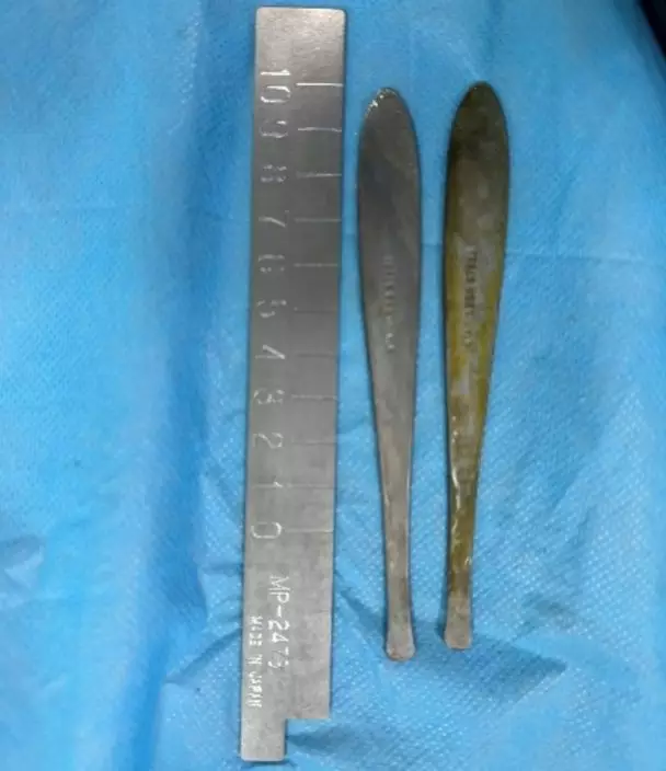 西安一名男子腹痛1周求醫揭腸道內藏兩把匙羹險造成穿孔,醫生花1小時成功取出。