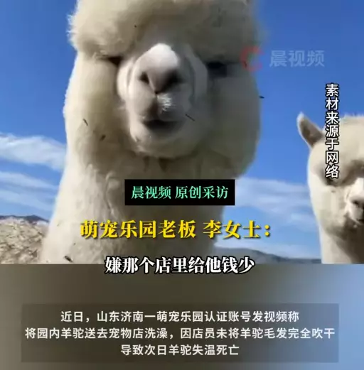山東濟南的李女士於11月8日發文控訴,指她將一隻羊駝送往寵物店洗澡,店員因未將羊駝毛髮完全吹乾,導致羊駝凍了一整晚後失溫死亡,相關消息引起熱議。