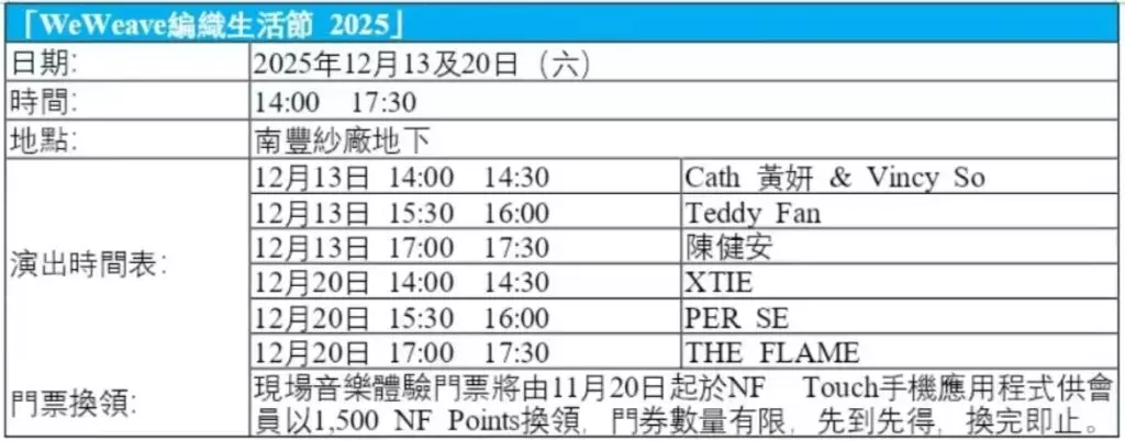 現場音樂體驗門票將由11月20日起於NF Touch手機應用程式供會員以1500 NF Points換領,門券數量有限,先到先得,換完即止。