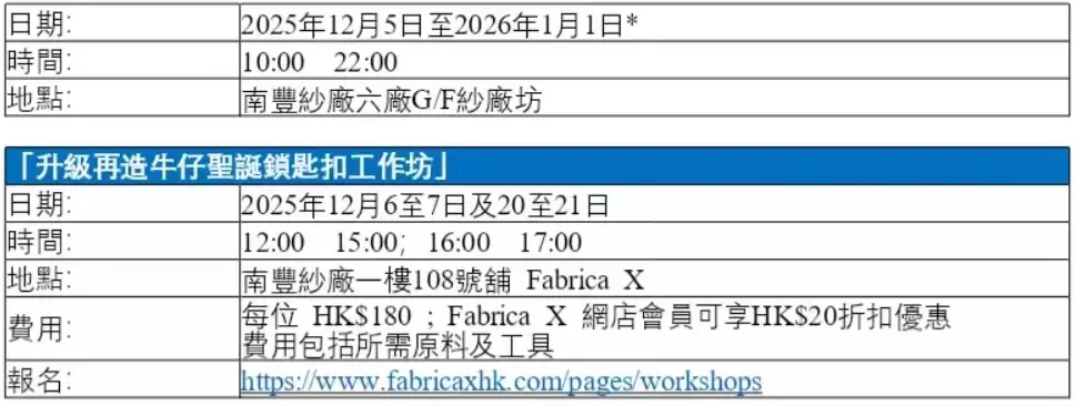 主張可持續生活方式的零售體驗店Fabrica X帶來「升級再造牛仔聖誕鎖匙扣工作坊」。工作坊獲非牟利組織SFAA支持,參加者可以牛仔布公司Prosperity Textile北江紡織捐贈的剪裁剩料及牛仔餘布創作出多用途配飾,既是鎖匙扣,亦可成為聖誕吊飾!你更可免費獲得專屬「The Mills Bros」熱壓貼紙,為你的作品添上玩味點綴。
