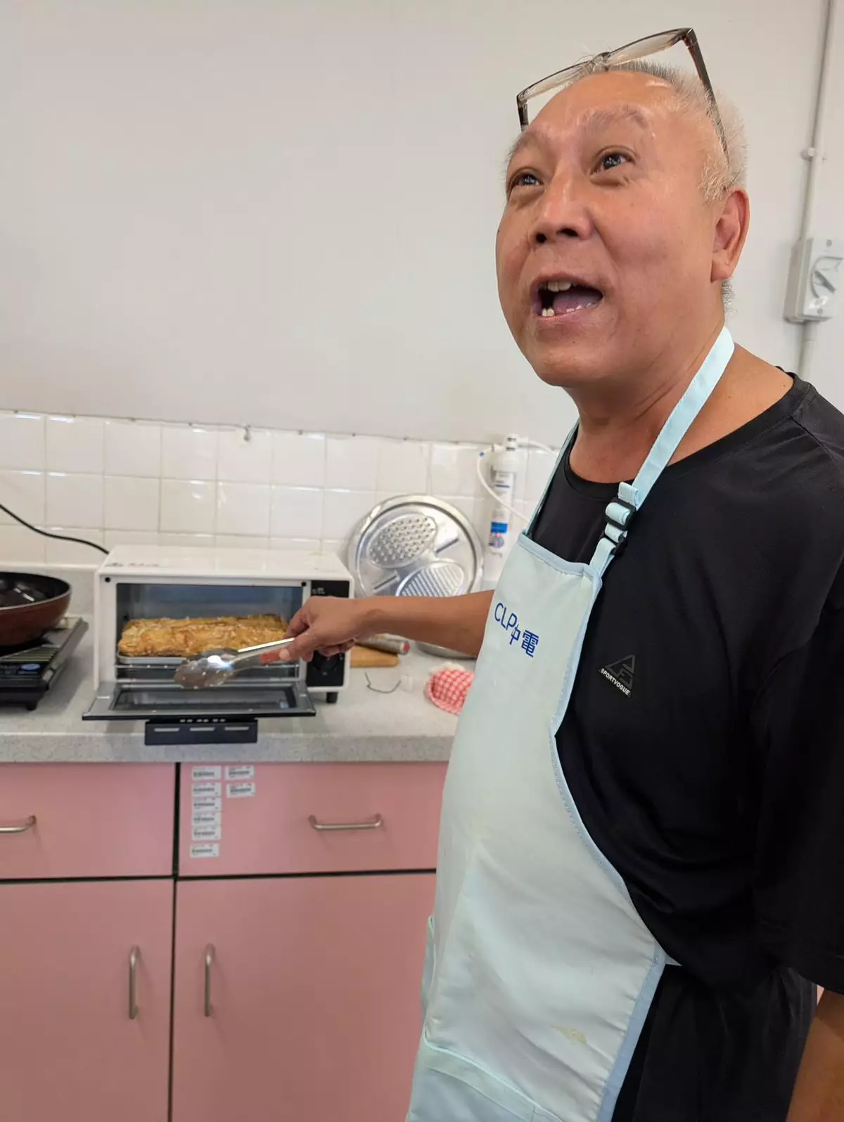 元朗攸壆路簡約公屋居民林先生率先體驗「電器圖書館」,試用電焗爐為家人炮製美食。