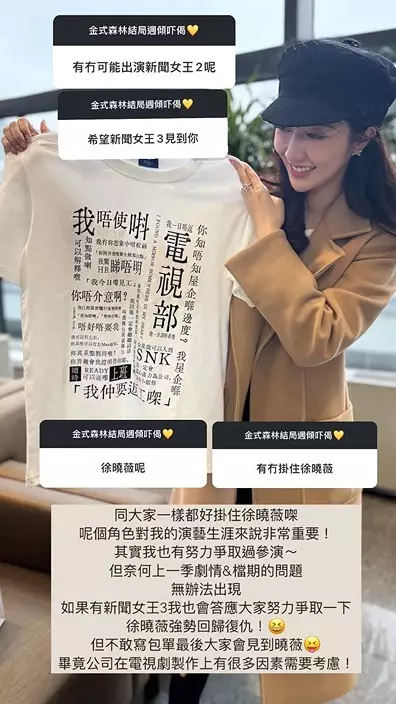 何依婷透露,未能回歸的關鍵在於「劇情走向」及「檔期衝突」兩大因素,「奈何上一季劇情同檔期問題,真係無辦法出現。」雖然有點遺憾,但她仍大派定心丸,承諾:「如果有《新聞女王3》,我一定會努力爭取返嚟,等徐曉薇強勢回歸復仇!」