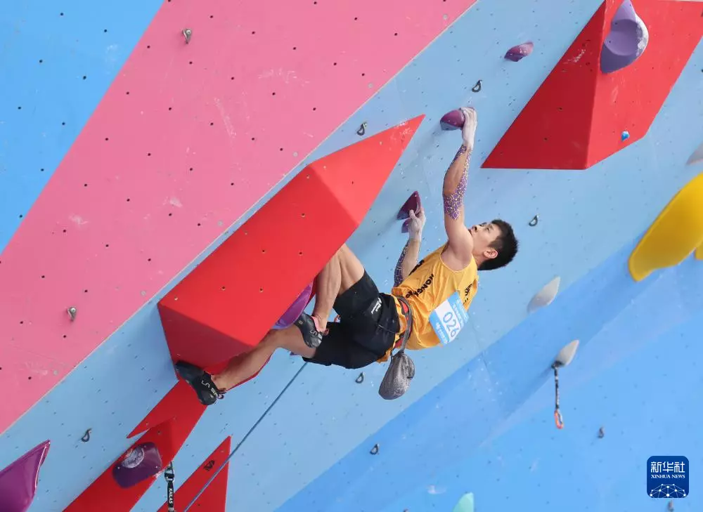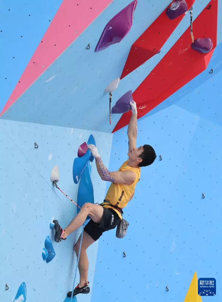 十五運會攀岩項目,港隊男子代表陳翔志,晚上會出戰難度決賽。新華網圖片