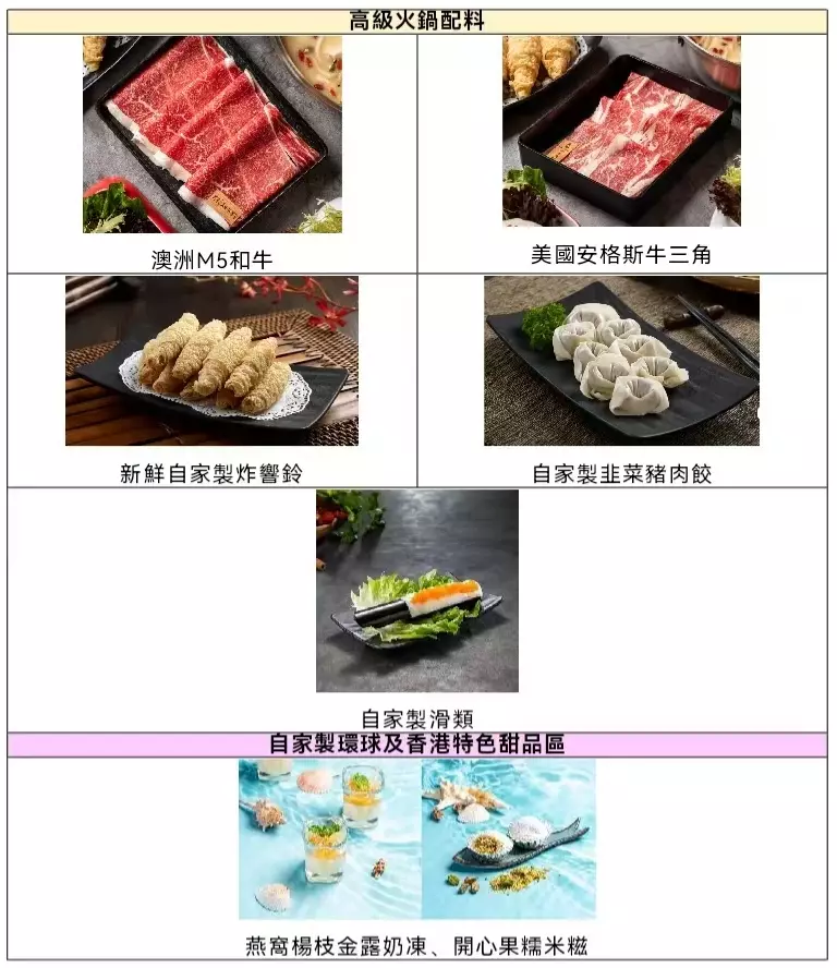 「美人漁」更於店內設活海鮮區,搜羅超過10多款新鮮活海產供食客即撈即食,更有專人清洗及處理顧客所撈的海鮮,包括紅蟹、大頭蝦、九節蝦、小蟶子、鮑魚及紐西蘭活青口等。火鍋配料方面,「美人漁」提供超過80款高級新鮮食材,例如澳洲M5和牛、美國安格斯牛三角、新鮮自家製炸響鈴、自家製滑類及自家製韭菜豬肉餃等。現場設立烹調專區,供應即燒即食海鮮及蔬菜。此外,甜品區提供差不多40款自家製中西式及現場即製甜品,為客人帶來多重味蕾體驗,開啟一場難忘的滋養之旅!