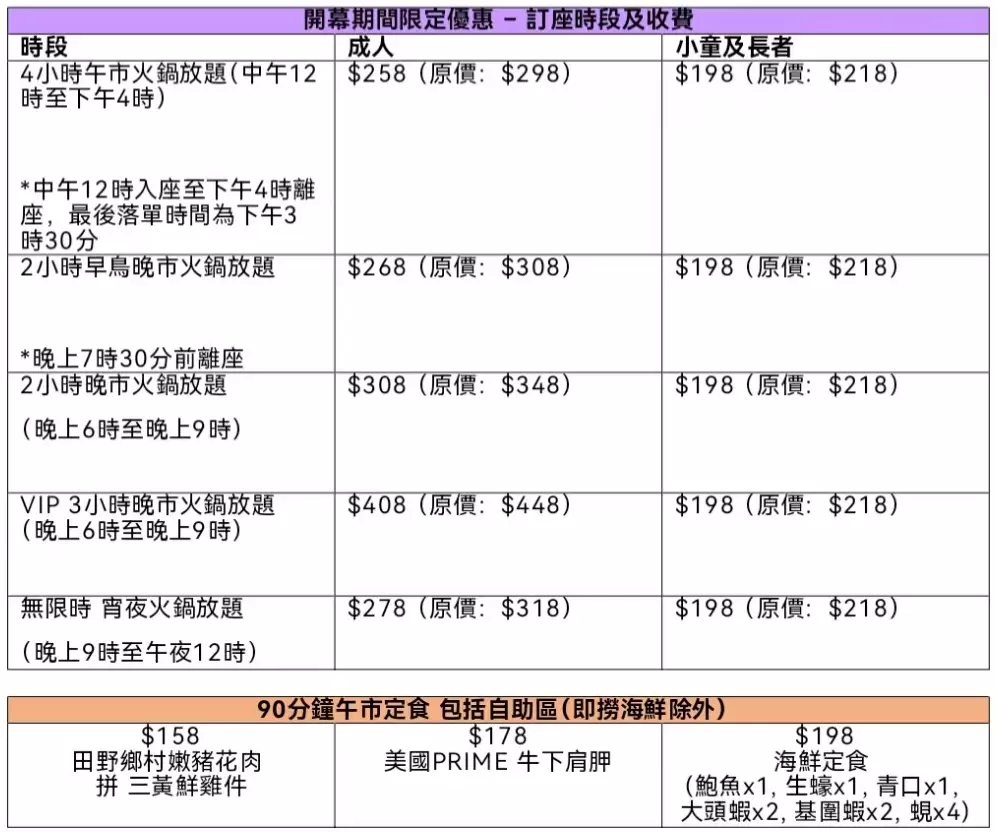 *條款及細則:此推廣活動由即日起至2025年12月3日 • 火鍋放題套餐只限堂食至少兩位起,如一位客人惠顧需另加HK$100 • 所有套餐包含六款基本單鍋湯底可選擇,可加HK$70升級獨家單鍋/鴛鴦鍋湯底 • 身高90cm以下小童佔座位費HK$90,不佔座位豁免收費 • 身高為90cm至130cm內以小童價格收取;身高130cm以 上為成人收費 • 用餐時間以入座時店員確認之時間為準,最後落單時間為時段完結前30分鐘 • 另收加一服務費(按原價計算) • 午市套餐星期六至日及公眾假期另加 HK$20;晚市套餐星期五至日及公眾假期另加HK$20 • 2小時時段用餐時間為訂座時間起計120分鐘,為時段完結前30分鐘 • 為請珍惜食物,如發現浪費食物,每 200克額外收取HK$30 • 圖片只供參考 • 不可與其他優惠、折扣或優惠券同時使用 • 如有任何爭議,樂天餐飲集團(香港)保留此優惠之最終決定權。