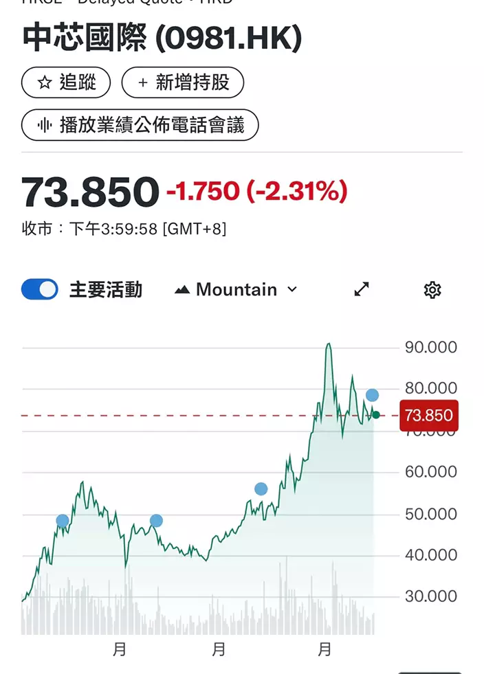 中芯股價在跌市中十分硬浄,周五收75.1元,只跌0.7%,遠低於科指2.8%的跌幅。未來中國的人工智能芯片需求很大,盡量會用國產芯片,而中芯是內地製作芯片的大戶,未來業績還有增長空間,維持趁低吸納,靜候明年業績進一步增長。
