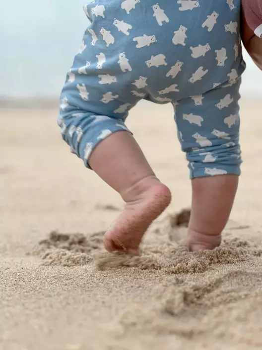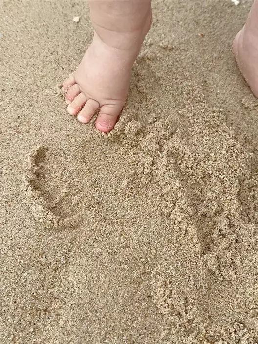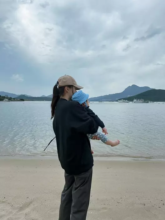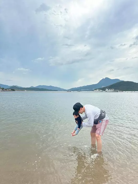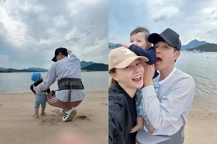 蕭正楠與黃翠如婚後生活美滿,近日二人帶同囝囝哈哈首次到沙灘玩樂,並在社交平台分享溫馨照片。見哈哈戴著帽子,由爸爸扶著站立,赤腳在沙地上行走,更嘗試玩水,表現勇敢毫不害怕。