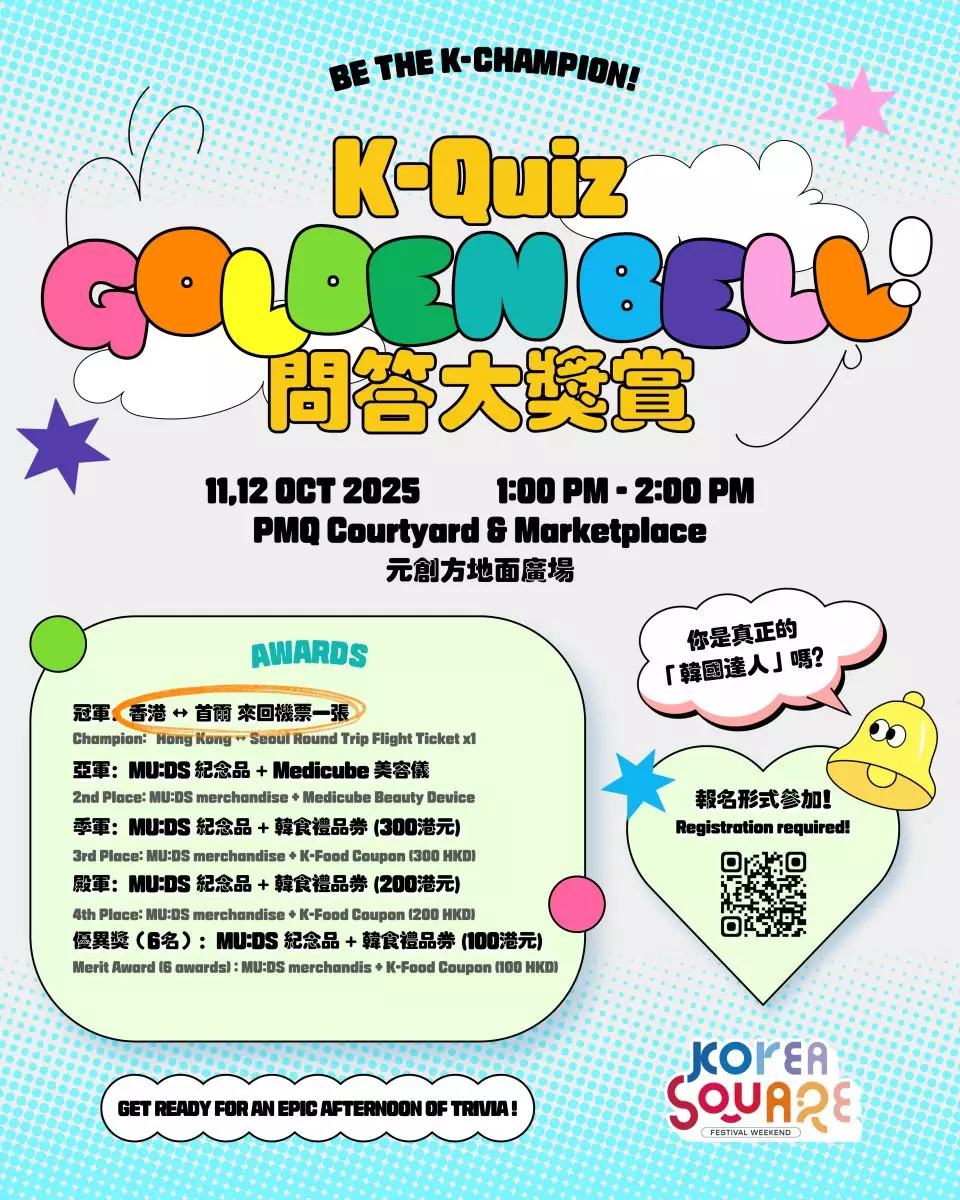 「韓國廣場2025週末節慶」將於10月11日至12日在PMQ元創方地面廣場舉行,一連兩日帶來多項沉浸式文化體驗。現場設有韓服試穿、傳統遊戲攤位、K-POP隨機舞蹈派對、跆拳道示範表演、K-Quiz問答大獎賞、韓食製作體驗、與香港亞洲電影節合作的韓國電影之夜,以及K-POP Community Performance,讓參加者全方位感受韓國文化活力。