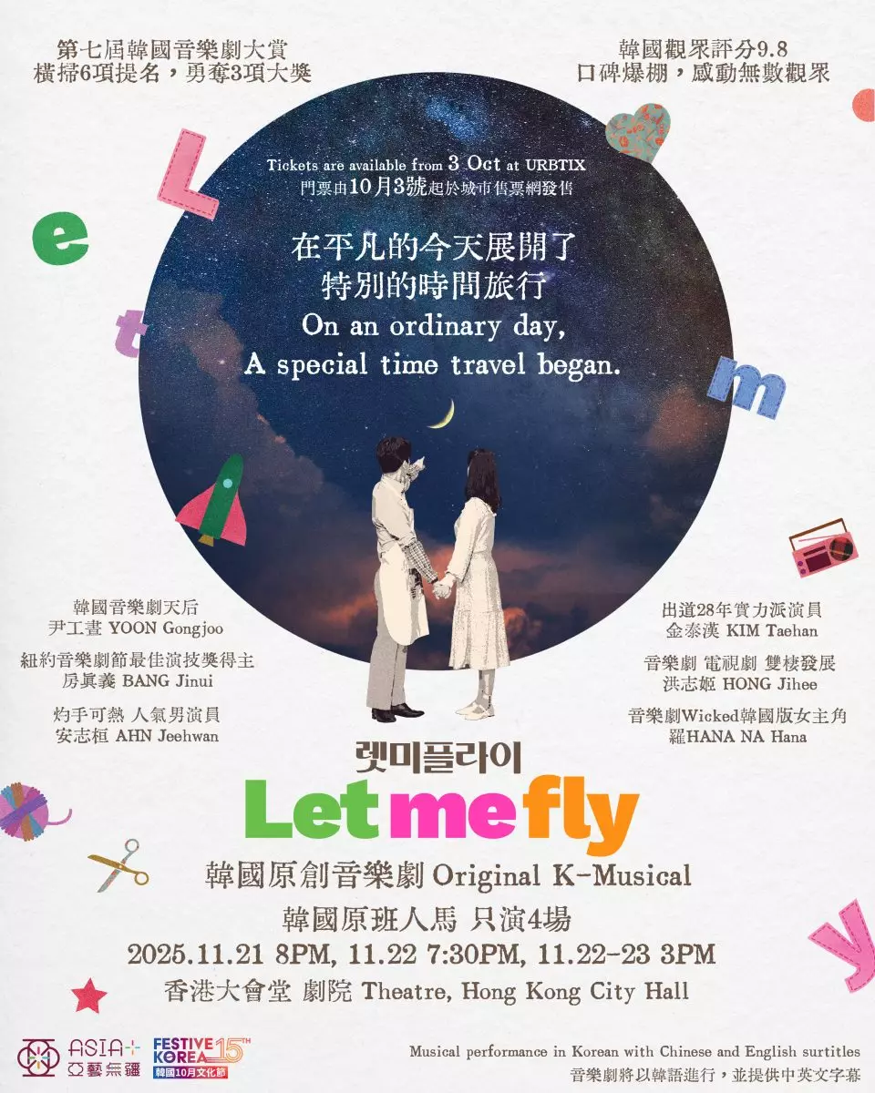 「第十五屆韓國十月文化節:音樂劇《Let Me Fly》」將於11月21日至23日在香港大會堂劇院盛大公演!此作品橫掃第七屆韓國音樂劇大賞六項提名,並勇奪三項大獎,包括「最佳作曲」、「最佳男子新人」及「年度最佳作品」。一眾實力派演員將聯手呈獻一場充滿情感與藝術張力的舞台盛宴,誠邀觀眾一同走進這段觸動心靈的劇場旅程!