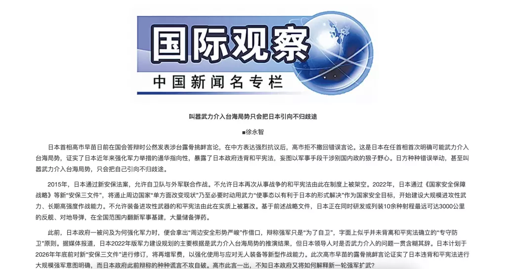 解放軍報發表署名文章,批評日本首相高市早苗日前在國會答辯時,公然發表涉台露骨挑釁言論,是日本在任首相首次明確可能武力介入台海局勢,證實了日本近年強化軍力舉措的遏華指向性,暴露了日本政府違背和平憲法,妄圖以軍事手段干涉別國內政的狼子野心,日方種種錯誤舉動,甚至叫囂武力介入台海局勢,只會把自己引向不歸歧途。