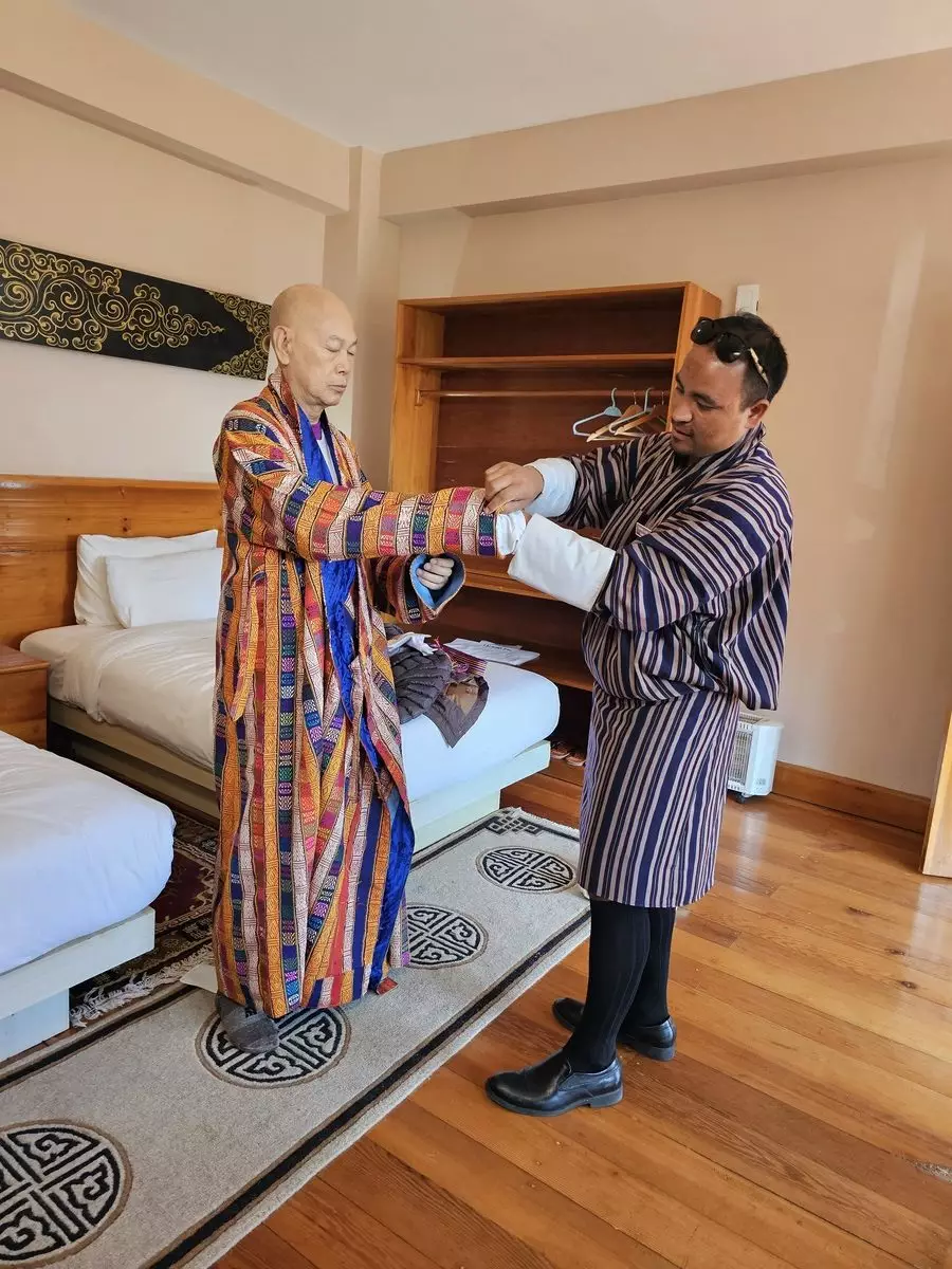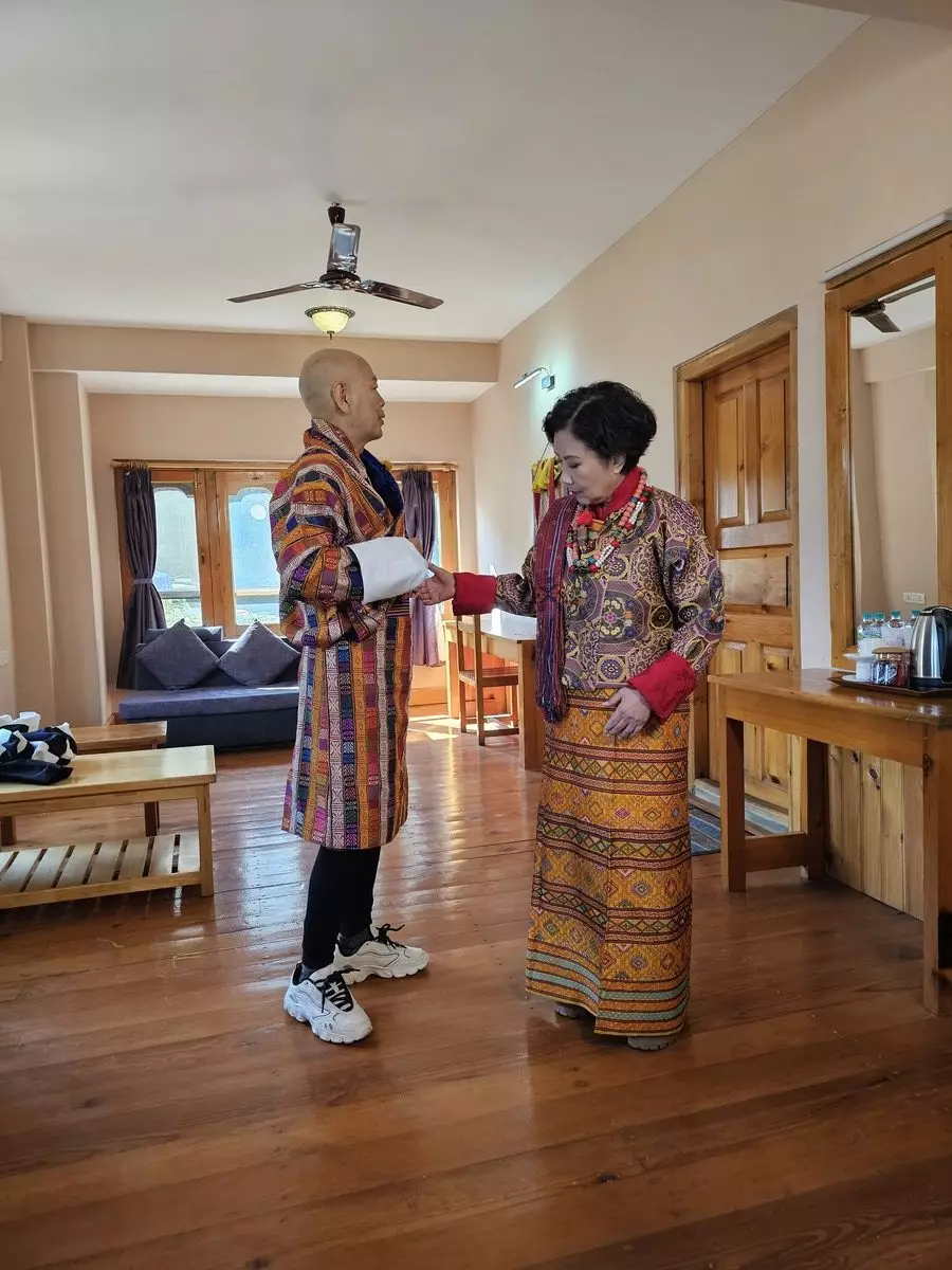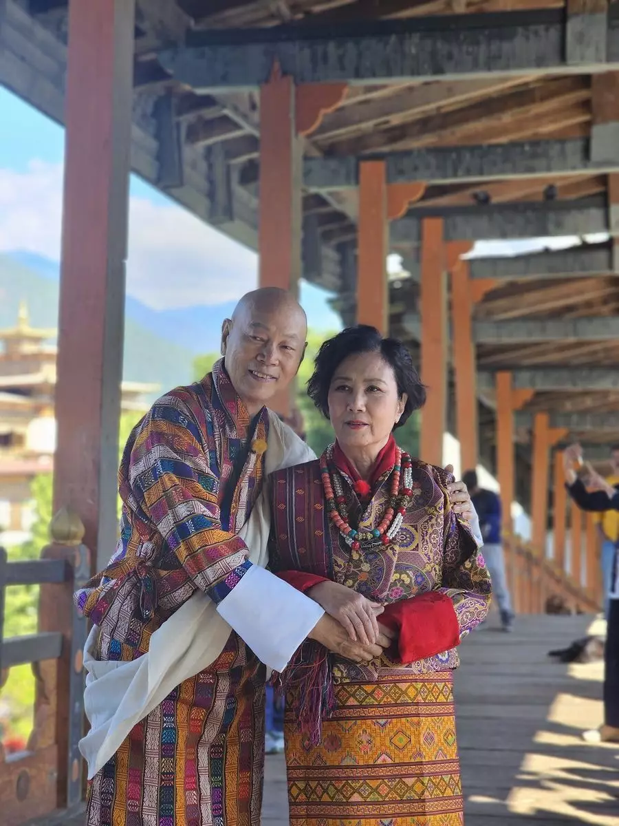 阿姐同家英哥著嘅,係不丹人大時大節著嘅傳統服飾,係用好靚嘅織錦嚟整。