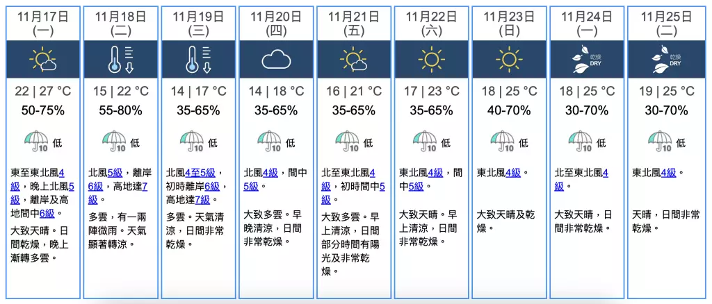 天文台展望星期一天晴乾燥,內陸地區日夜溫差較大。本週中至後期大致多雲。週末北風增強,氣溫顯著下降。