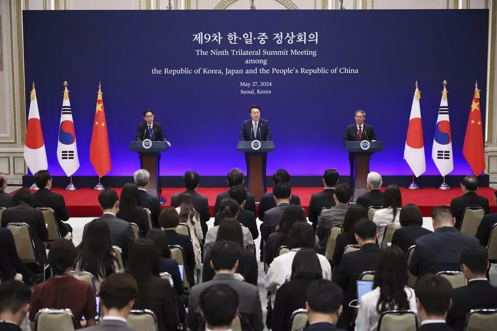 南韓總統室將「韓中日」定為為東北亞三國官方表述順序。AP資料圖片