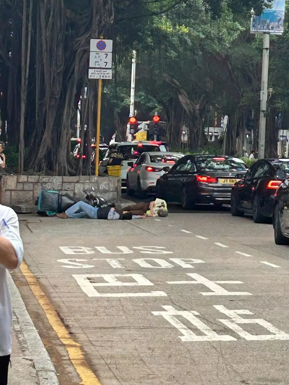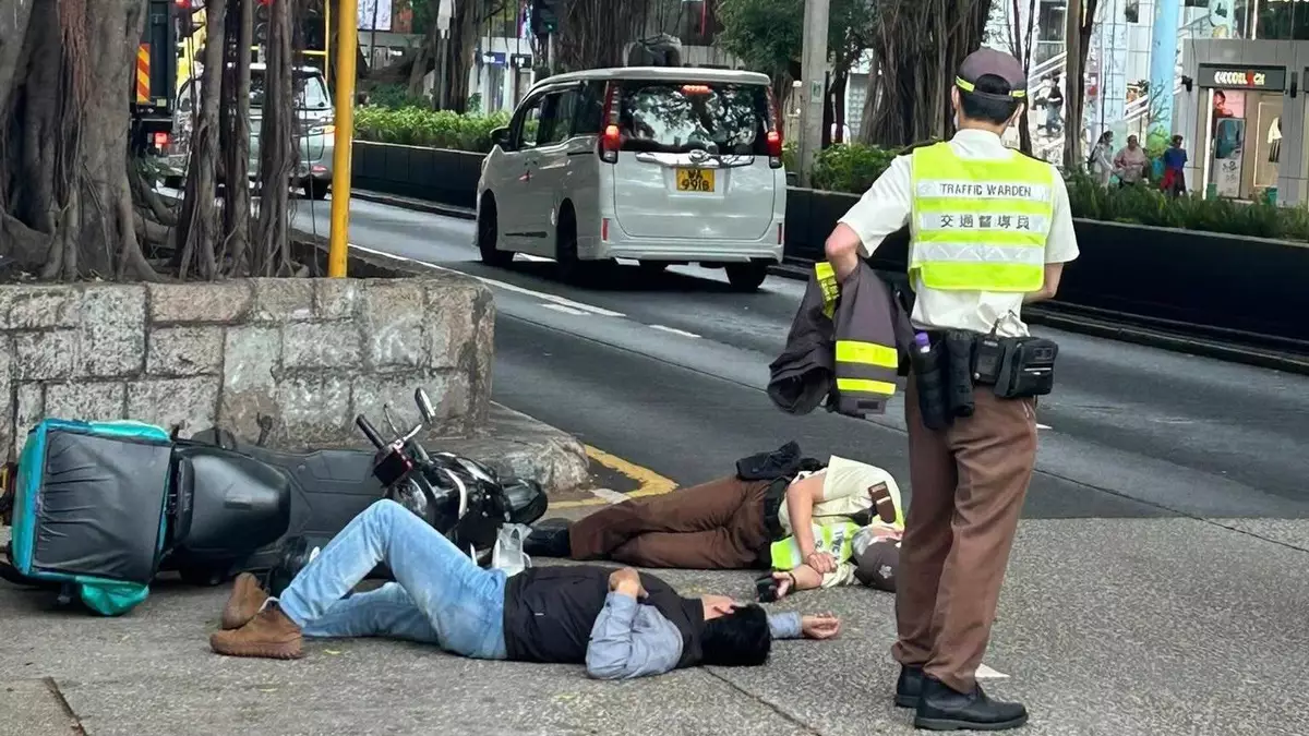 事發後電單車翻側,駕駛該電單車的外賣車手及交通督導員雙雙倒卧馬路上,另一名交通督導員隨即上前查看。