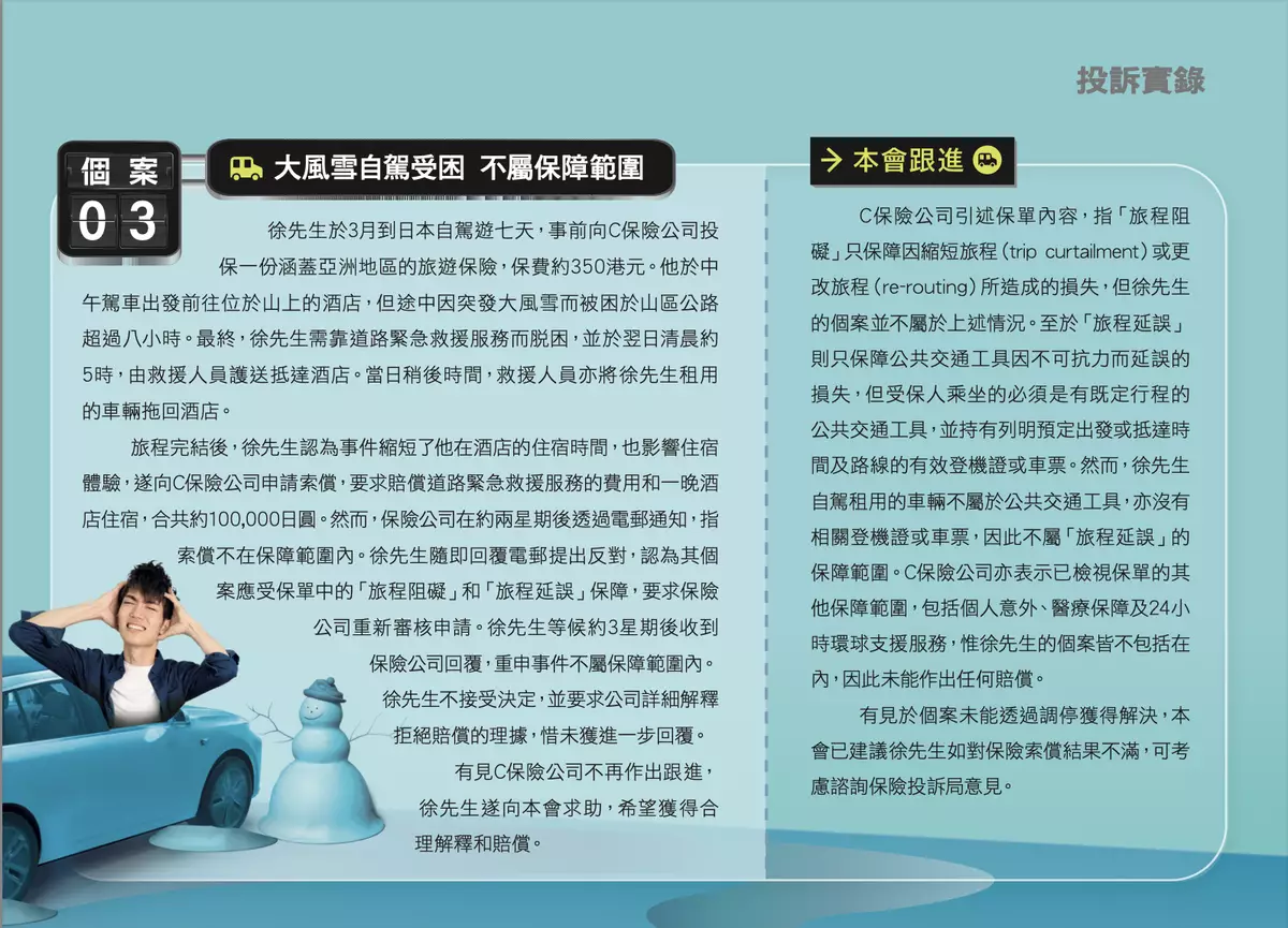 第三宗個案涉及投訴人到日本自駕遊,途中因為大風雪一度被困山區,最終行程縮短。投訴人向保險公司要求賠償道路緊急救援服務費用和一晚住宿,合共10萬日圓,但獲通知自駕遊不屬公共交通工具,亦沒有車票等,因此索償不屬旅程延誤的保障範圍。