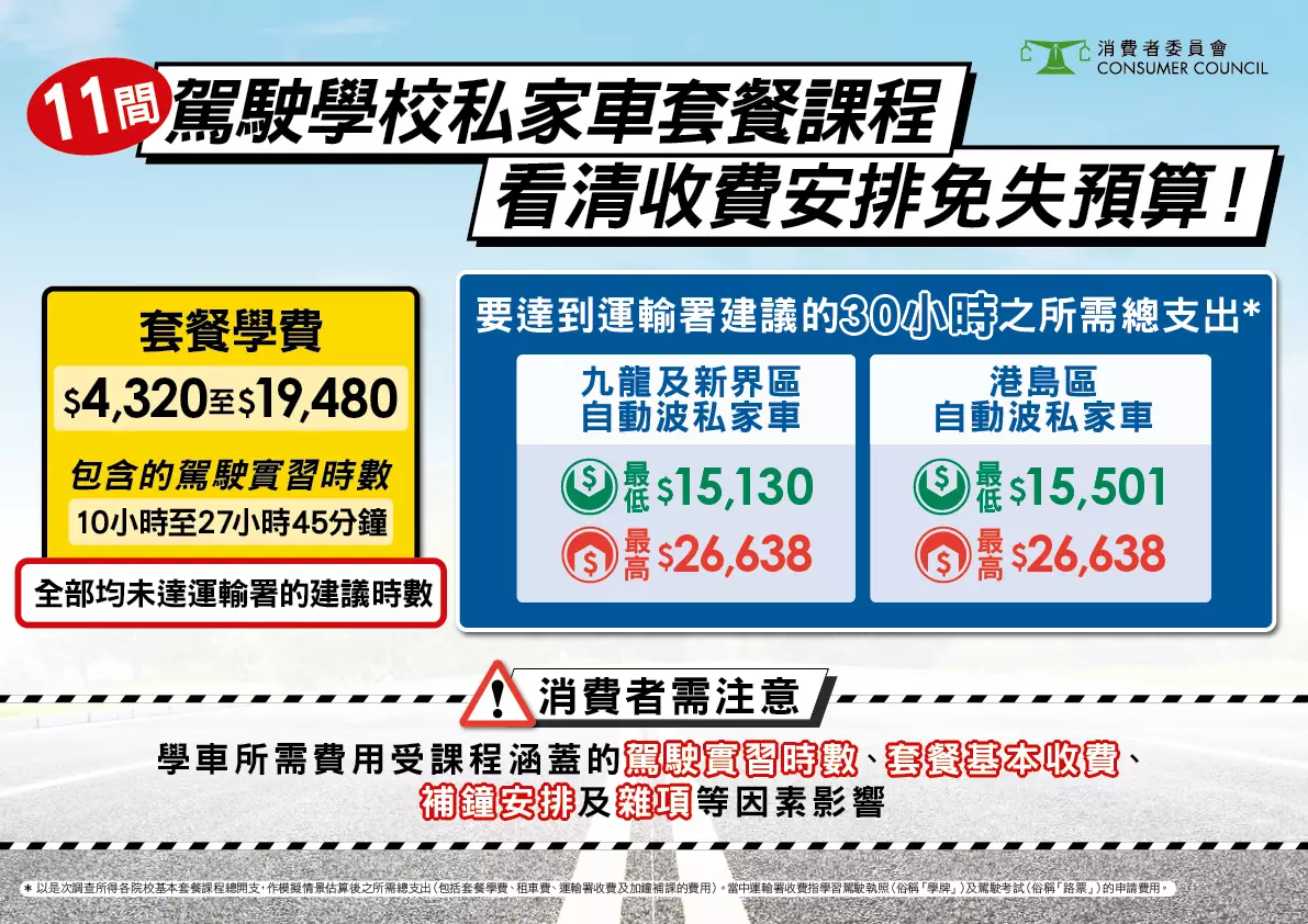 消委會就本港駕駛學校的學車套餐課程進行市場調查,發現所有基本套餐課程所涵蓋的駕駛實習時數,均未達運輸署建議的30小時,學員往往需額外加鐘補課,實際總支出可遠超宣傳價格。