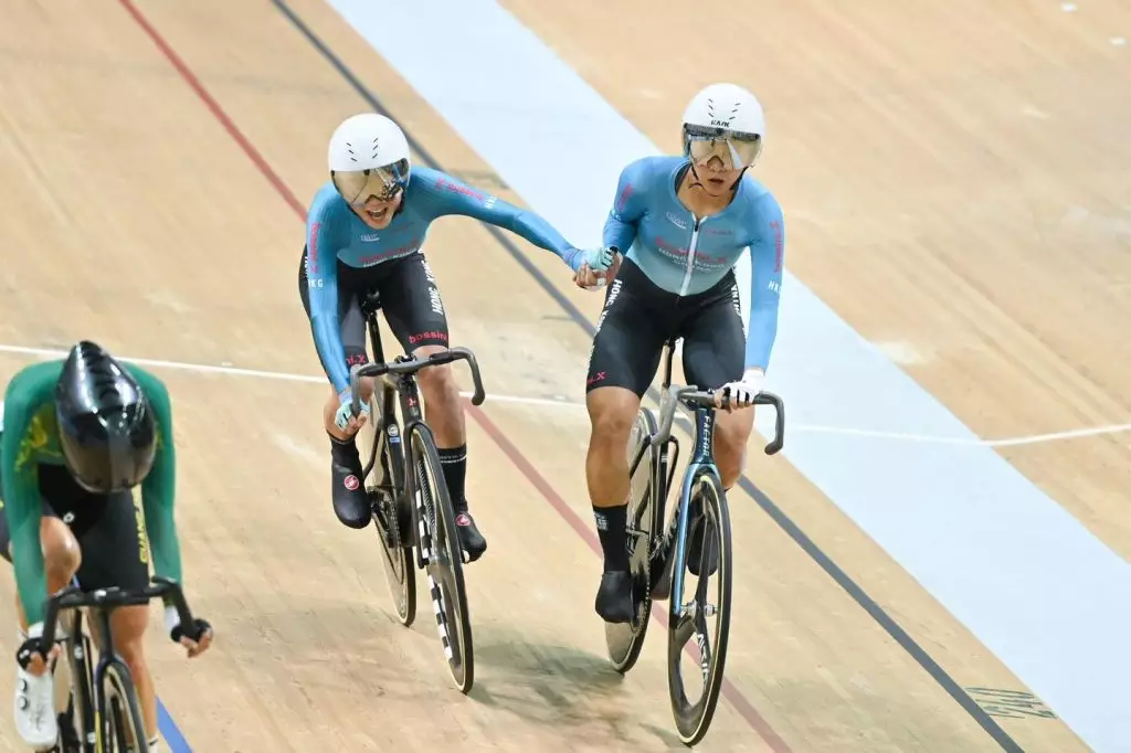 女子全能賽港隊單車手李思穎(右)於首項捕捉賽取第一名。2025全運會香港賽區FB圖片