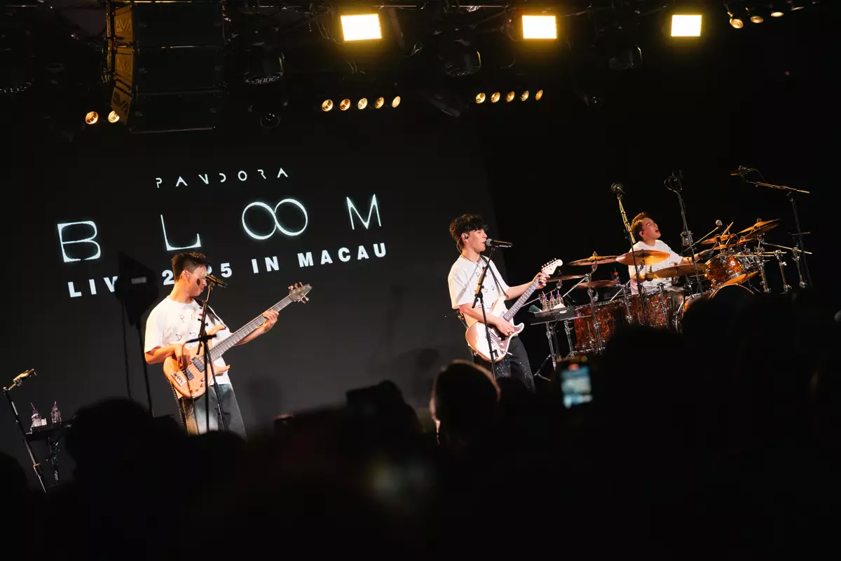 獨立樂隊Pandora昨晚(11月15日)於澳門銀河 G Box 舉行,由光尚娛樂主辦的Pandora《BLOOM LIVE 2025》IN MACAU演唱會。繼上月香港麥花臣場館兩場爆滿後,低音結他手Anakin(阿勤)、主音兼結他手Tony及鼓手Michael(細佬)三子再戰澳門,以近兩小時、26首歌的療癒系搖滾演出,將力量與溫暖傳遞給現場每一位「盒仔」。