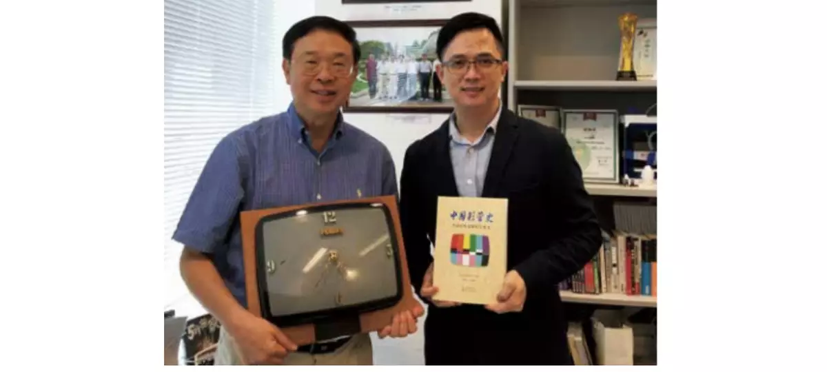 美國RCA送贈彩管鐘以慶祝香港新駿在中國銷售第一個100萬隻彩管(1996)。由楊向杰(左)主編,陳偉中博士(右)編著的《中國彩管史》亦在北京首發,全國發行(2019)。楊向杰供相