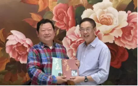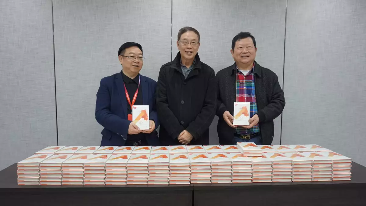 長虹原董事長郭德軒(右)和現任總裁郭龍(左)接受楊向杰(石中英)贈《我愛秋風勁》予長虹的青年工人。楊向杰供相
