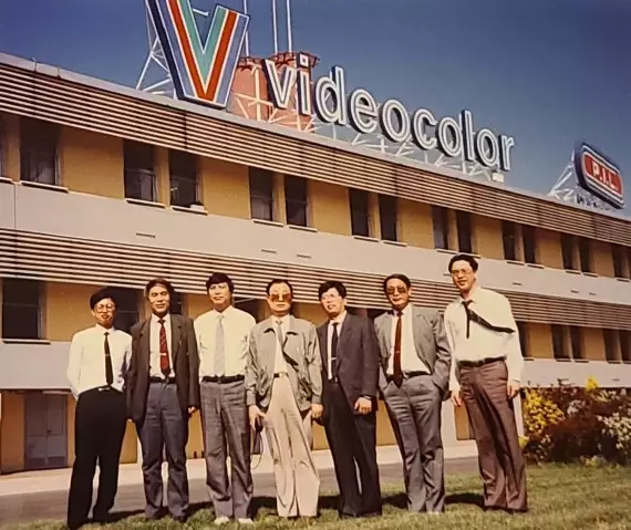 作為法國Thomson在華總代理的香港新駿總經理楊向杰,受中國電子工業部的委託,率團赴歐考察,在意大利的Videocolor彩管廠前留影。(1991)楊向杰供相
