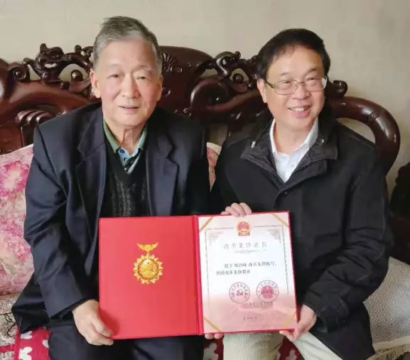 倪潤峰(左)在家中,向到訪的楊向杰(右),展示由習近平主席在人民大會堂親頒的「改革先鋒」證書,以表彰其對「軍轉民」的貢獻。(2019)楊向杰供相