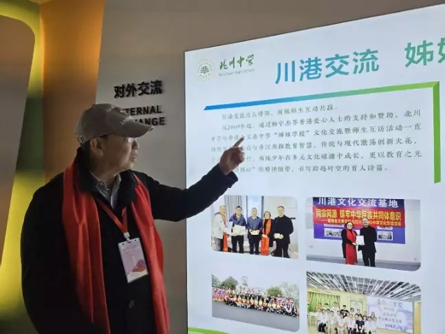 楊向杰在北川中學校史館內「川港交流姊妹同心」專題介紹,發現了自已的名字。欣喜成為了北川校史的一部分。巴士的報記者攝