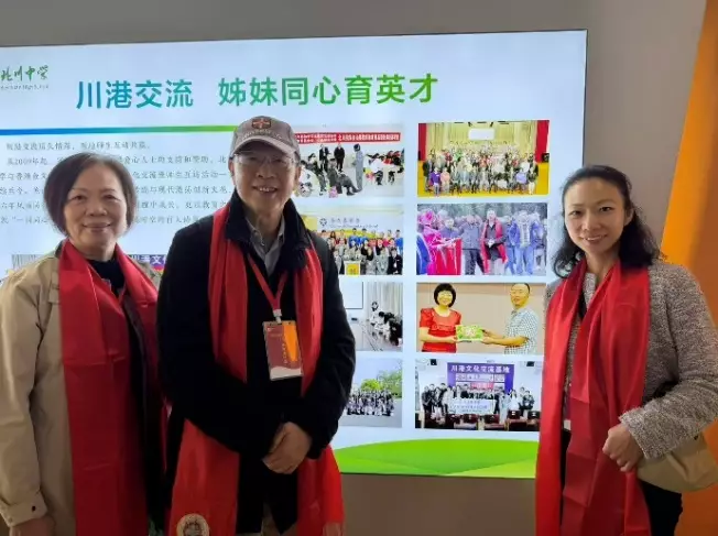 在北川中學校史館內的「謝鏡添梁中昀楊宇杰基金會」主席楊向杰(中),副主席梁陳倩霞(左),和總幹事梁小芸(右)。(2025)巴士的報記者攝