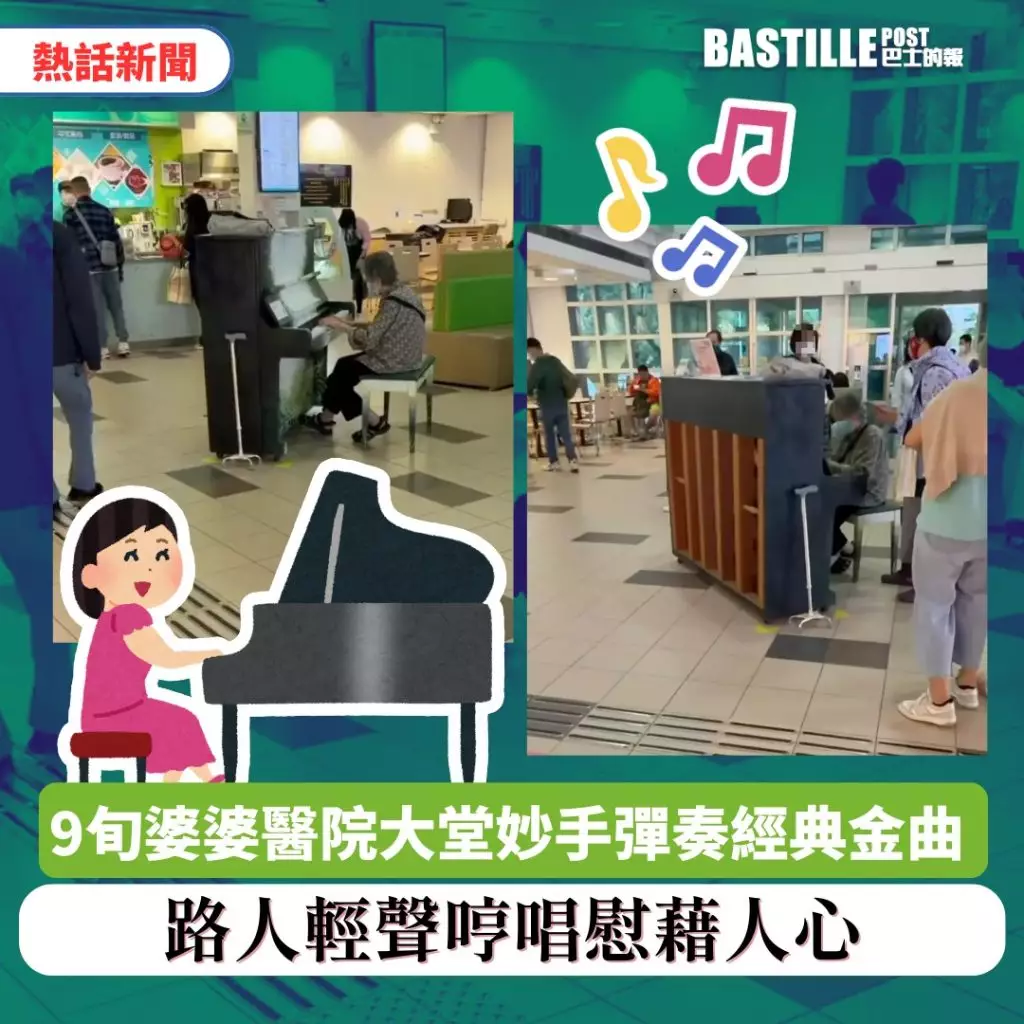 有網民日前在社交平台Threads分享短片,指自己「去醫院借尿遁,無諗過喺醫院大堂有個婆婆喺度彈琴,側邊仲有人一齊陪婆婆唱萬水千山總是情,好和諧」。影片所見,婆婆流暢的演奏《萬水千山總是情》及《上海灘》等電視劇主題曲,吸引不少行色匆匆的途人停下腳步。
