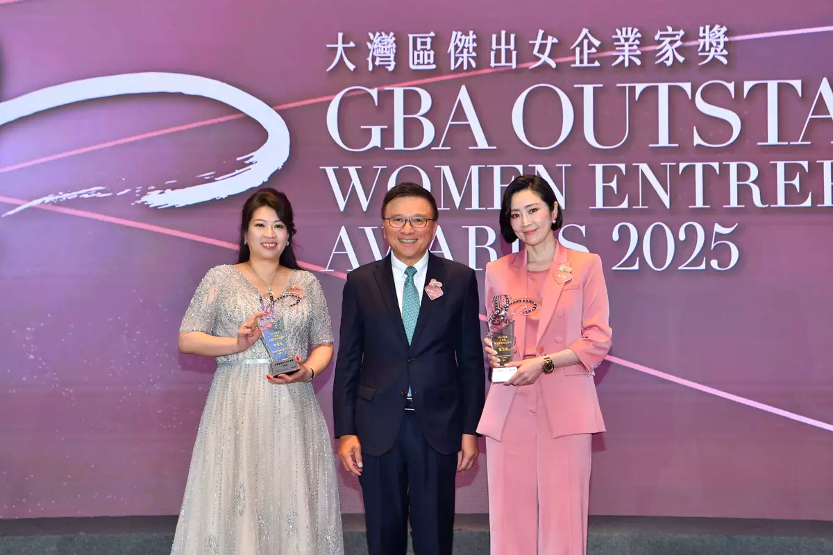 陳家強教授(中間)頒發「2025年度大灣區傑出關愛女企業家獎」給兩位得獎者:灝濟海外發展有限公司創辦人林夏瑤(圖左)、 張玉珊博士(圖右)。