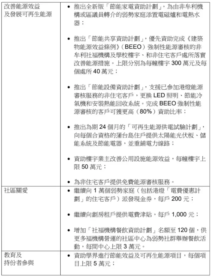 港燈亦會推出全新的「節能家電資助計劃」,為弱勢家庭(例如長者、殘疾人士、長期病患者等)提供節能電磁爐和電熱水器,提升能源效益、加強防火安全和改善室內空氣質素。
