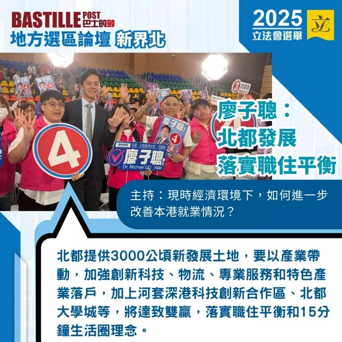 4號廖子聰就認為,應積極落實「職住平衡」及「15分鐘生活圈」理念,北都會未來提供3000公頃新發展土地,應把握機會,回應市民在房屋、青年上流、多元化發展和增加就業機會等難題。規劃中,北都能提供50萬個新住宅單位,有很多建設、很多工種都需要職訓及員工投入;另北都要以產業帶動規劃,加強創新科技、物流、專業服務和特色產業落戶,推動河套深港科技創新合作區和新田科技城發展;而北都大學城,需爭取更多頂尖學者及學生來港,應增加課程及大學的職種,達到雙贏局面