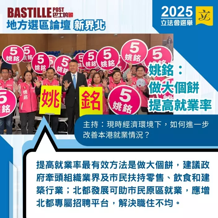 5號姚銘則指,要提高就業率,最有效方法是「做大個餅」,做大產業,增加就業職位,除傳統優勢行業如金融、貿易,亦需扶持零售、飲食和建築行業,由政府牽頭業界組織及市民參與推動,才能盡力做到雨露均霑;另北都發展可創造更多就業空間,居民原區就業,在新界北居住、生活、發展,多陪伴家人,解決職住不均問題,應增加北都專屬招聘平台。