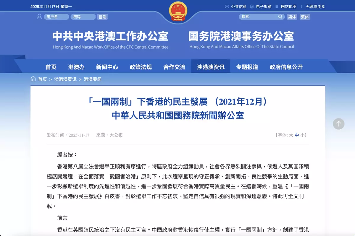 國務院港澳辦轉載媒體刊發關於《「一國兩制」下香港的民主發展》白皮書的重溫和社評文章。港澳辦網頁
