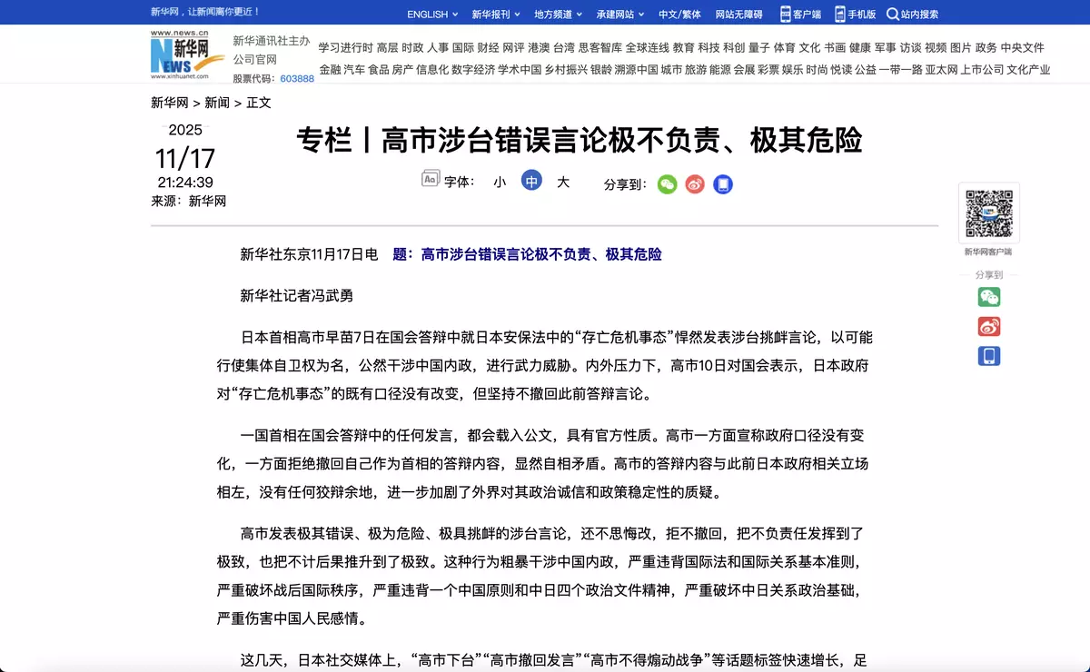 新華社發表文章,指高市早苗涉台錯誤言論極其危險。新華社網頁截圖