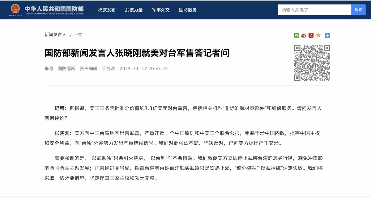 國防部新聞發言人張曉剛回應提問時表示,美方向中國台灣地區出售武器,嚴重違反一個中國原則和中美三個聯合公報,粗暴干涉中國內政,損害中國主權和安全利益,向「台獨」分裂勢力發出嚴重錯誤信號。中方對此強烈不滿、堅決反對,已經向美方提出嚴正交涉。