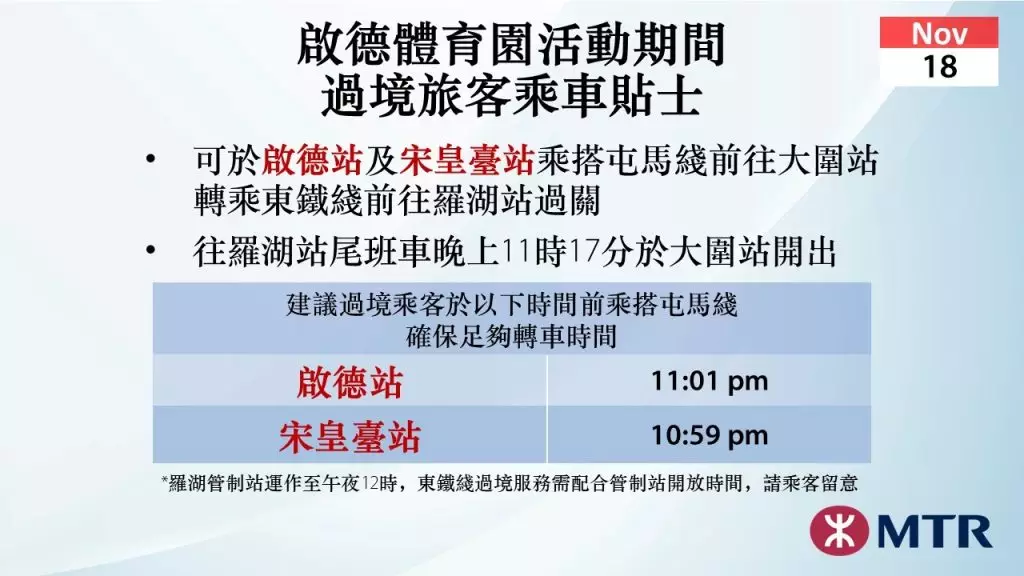 另外,港鐵公司提醒過境旅客留意東鐵綫尾班車時間,提早計劃行程及預留足夠轉車時間。