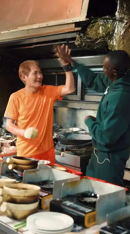 Khaby 於三代相傳的深水埗大排檔,品嚐鑊氣十足的港式小炒,更驚嘆師傅在熊熊 火焰中拋鑊炒菜,火光四射卻神情自若。旅發局提供