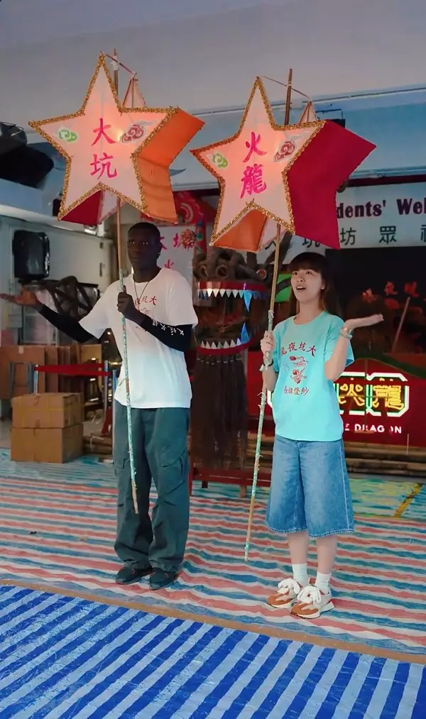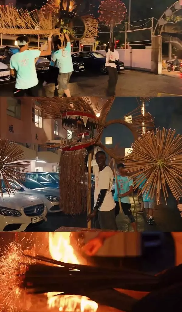 在舞火龍總指揮張國豪的指導下,Khaby 學習地道舞火龍的陣式與技巧,並親身舞動以麻繩、珍珠草紮成,插滿近 3 千枝長壽線香的火龍,感受傳統節慶文化。旅發局提供