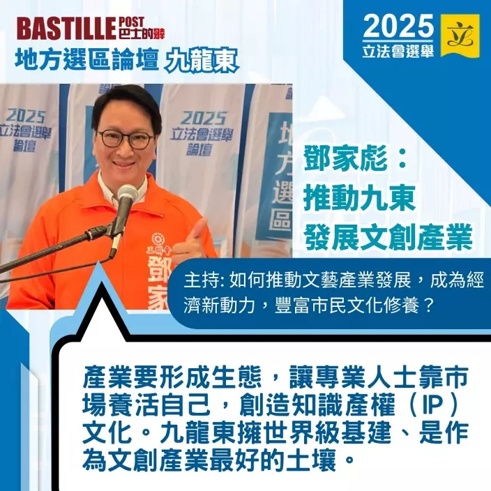 就第二條問題,推動文化藝術產業發展,1號鄧家彪指,產業要形成一個生態,可養活業內人士,創造、設計周邊產品,發展知識產權(IP)文化,九龍東擁有最好條件,講文創產業,有啟德體育園、東九文化中心,以及商務區有大量多元化商業空間,60%辦公室是低於1000平方呎,3成以下企業交租不用1萬元,就是最好土壤做文藝;地區團體用市場化方式,把文藝活動辦得有聲有色,故九龍東絕對是最適合做文創產業。