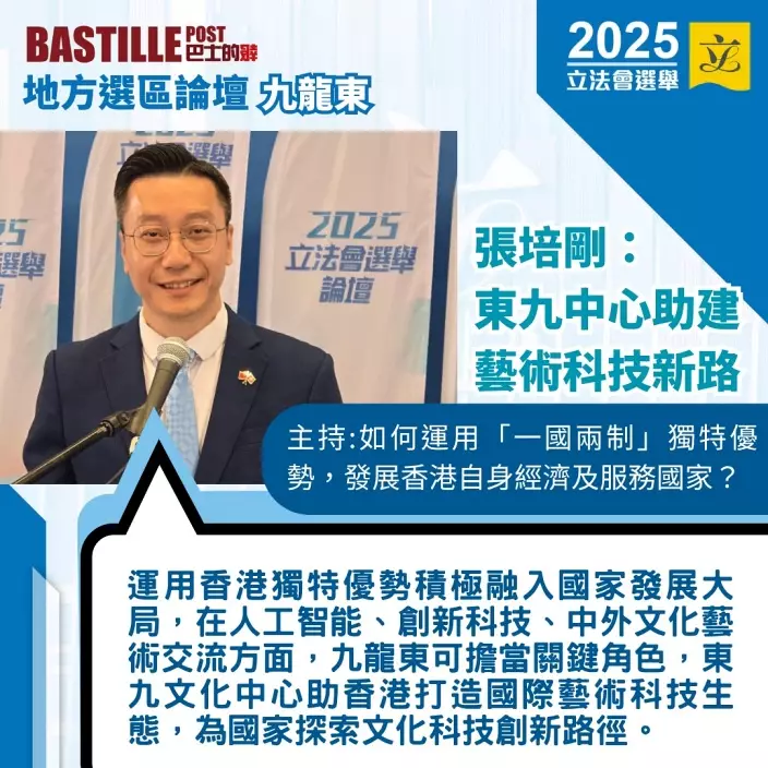 就運用香港的「一國兩制」獨特優勢,2號張培剛認為,香港要積極融入國家發展大局,在人工智能、創新科技、及中外文化藝術交流方面,九龍東可擔當關鍵角色,東九文化中心作為本港科技技術旗艦平台,推動藝術及科技融合提供優質場地,助香港打造國際水平藝術科技生態,也為國家探索文化和科技探索新路徑;「起動九龍東」可作為香港第二核心商業區,成為創業孵化基地,協助青年融入大灣區,把握國家發展機遇。