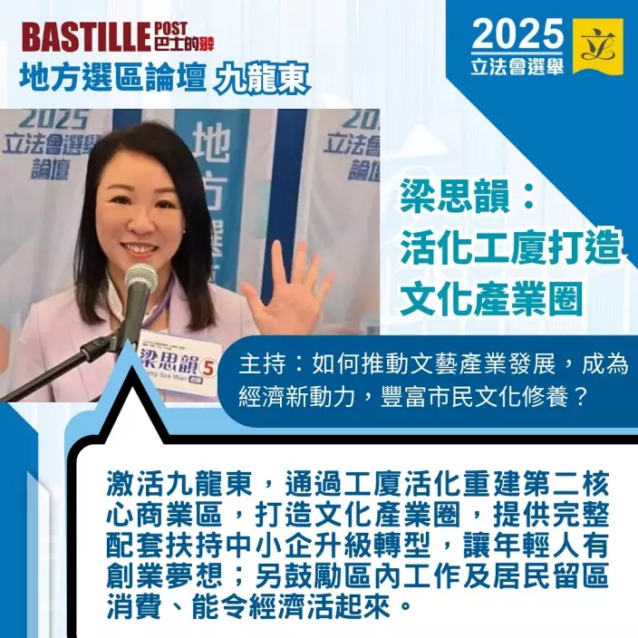 就推動文藝產業發展成為經濟新動力,5號梁思韻指,九龍東的核心商業區(CBD)需要重建,通過工廈活化,打造文化產業圈,配套扶持中小企,令年青人有創業夢想。她指,一直有很多文創公司落戶香港,需要政策扶持,才能升級轉型。東九龍有海濱,鄰近郵輪碼頭,遊客落地後可前往九龍東旅遊時,可帶動文藝產業,;另在九龍東居民願意留區消費,就能提振九龍東經濟。
