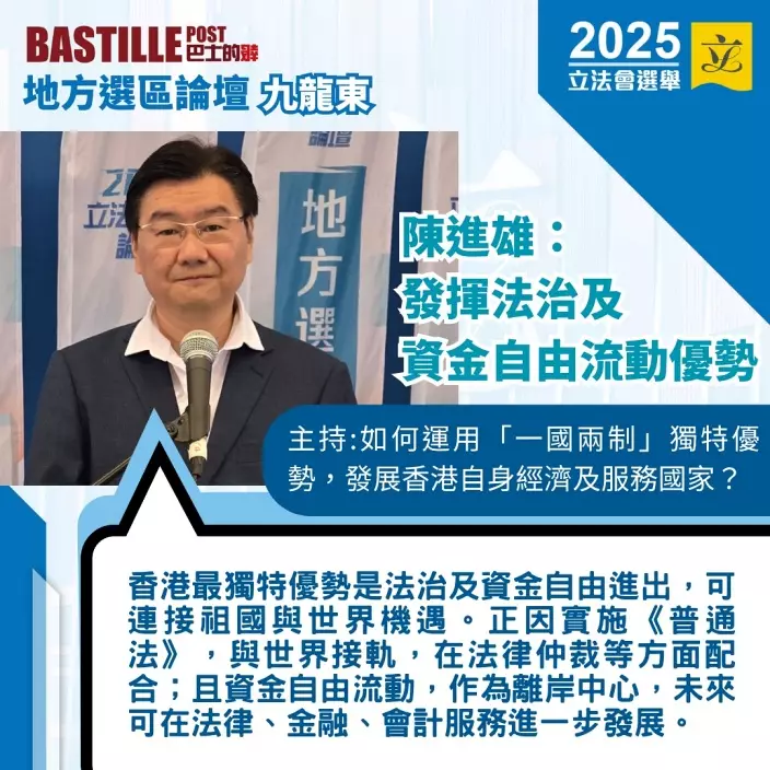 4號陳進雄認為,香港最獨特的優勢是法治及資金自由進出,香港可連接祖國的機遇,也可面對世界的機遇,作為一個橋樑或窗口,把中國和西方連接起來。香港實行《普通法》,和世界接軌,在法律仲裁等方面,可和世界配合,另資金流向也很重要,香港是一個很好的離岸中心、黃金市場,未來可在這兩方面發展法律、金融、甚至會計服務。