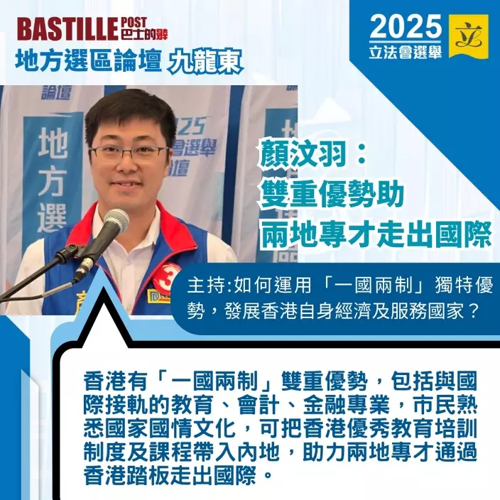 3號顏汶羽則指,本港有雙重優勢,不論在教育、會計、金融專業,都與國際接軌,港人熟悉國家的國情、文化,香港有5間百強大學,把香港的優秀教育培訓體制帶入內地,助力香港和內地專才、優才,可通過香港這踏板走出國際;另日常通關、北上消費,或內地人來港工作生活,未來可把兩地人員的地域流動阻礙打破,「一試多證」、資歷互通等,有助更好發揮「一國兩制」優勢。