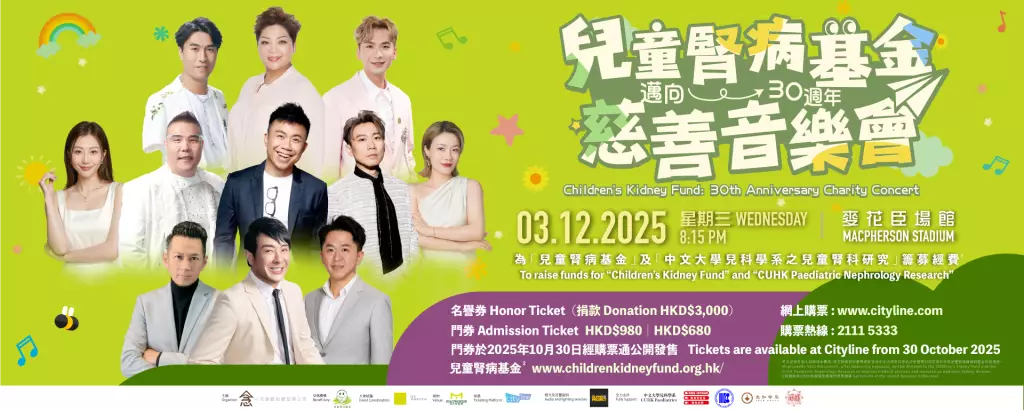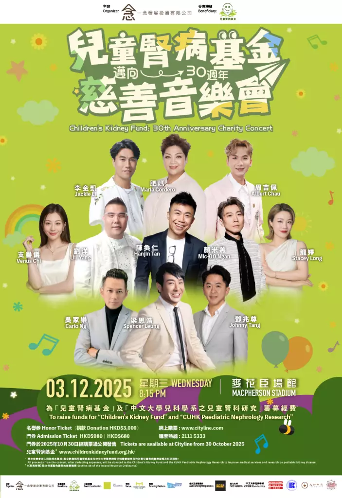 為慶祝「兒童腎病基金」邁向30週年,同時為兒童腎病研究及病童家庭籌募更多支援經費,《兒童腎病基金 邁向30週年慈善音樂會》將於12月3日 (星期三) 晚上在麥花臣場館舉行,參與歌手及藝人包括肥媽 Maria Cordero、梁思浩、吳家樂、鄧兆尊、陳奐仁、周吉佩、龍婷、支嚳儀、顔米羔、劉洋和李金凱,屆時大家一起以音樂傳遞愛與希望。票價分別為$3000 (名譽券)、$980 和$680 三種,現於Cityline公開發售。