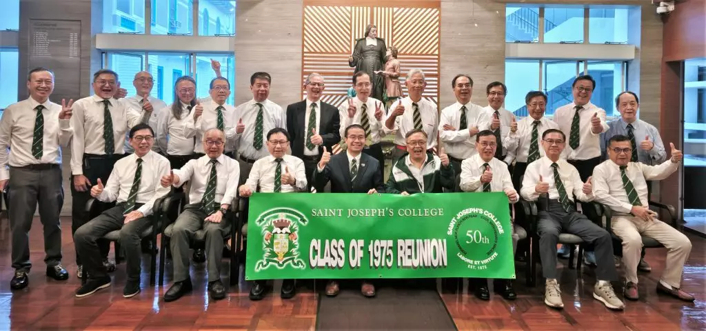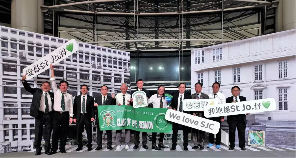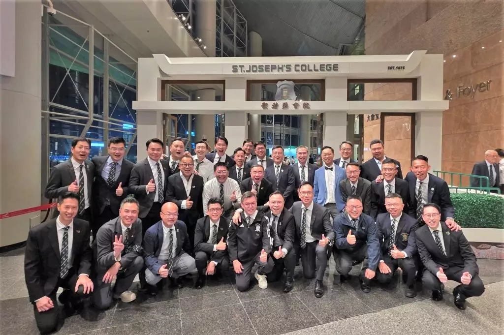 當晚會場重現了一條別具意義的領帶—聖若瑟書院於1975年百周年校慶時特別設計的紀念領帶。那是當年會考畢業班的舊生們共同約定穿上的記認,象徵著一段青春歲月的凝聚。筆者有幸與這群穿越時光的大師兄合照,命運讓鏡頭在此刻溫柔對焦,彷彿將半世紀的情誼定格於一瞬。