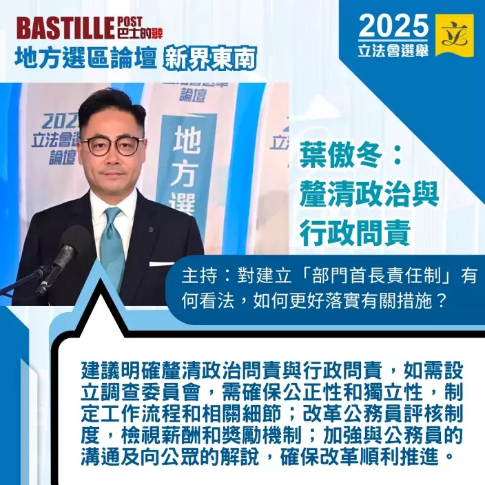 就建立「部門首長責任制」,1號葉傲冬表示支持,認為有助強化政府治理能力,在具體落實層面,建議建立有效機制明確區分屬「政治問責」還是「行政問責」,釐清責任歸屬;另如需設立調查委員會,須確保其公正性與獨立性,應制定明確工作流程與相關細節,以回應廣大市民關注;在推行問責制同時,行政長官也提出改革公務員評核制度,建議同步檢視公務員的薪酬結構及獎勵機制,並加強公務的溝通及向公眾解說。