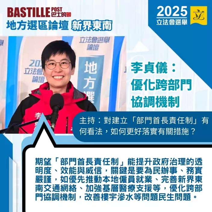 2號李貞儀亦認同「部門首長責任制」,期望能提升政府管治透明度、效能與威信,而最根本是要為民辦事、務實嚴謹,優先推動本地僱員就業、完善交通網絡、建馬鞍山醫院、延伸將軍澳醫院服務範圍、加強基層醫療支援等,相信「部門首長責任制」能進一步優化跨部門協調機制,有效改善漏水、滲水及冷氣機滴水等民生問題。
