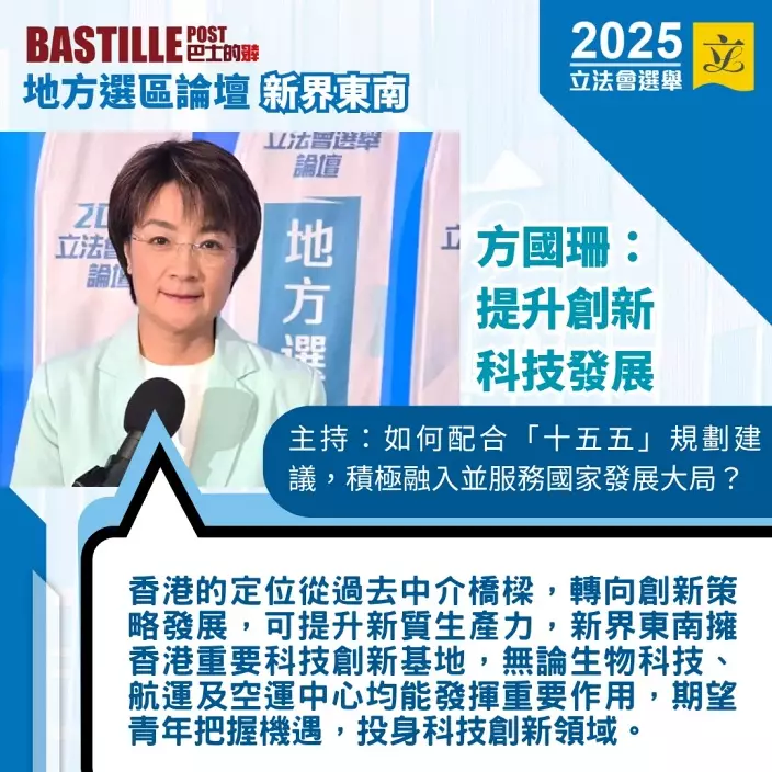 就融入國家發展大局,3號方國珊指,在國家「十五五」規劃中,已加快實現高水平科技自立自強為核心發展目標,香港的定位也從過去的中介橋樑,轉向創新策略發展方向,本港可提升各行各業新質生產力,助企業開拓國際市場。在新界東南選區內,擁重要科技創新基地,包括將軍澳生物科技、航運及空運中心,能為國家作貢獻,期望青年把握機遇,投身科技創新領域。